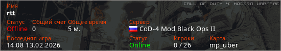 Играет на Call of Duty 4: Modern Warfare сервере. Страна: РоссияПервый раз замечен 14:06 13.02.2026