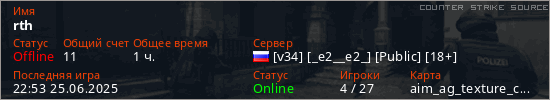 Играет на Counter Strike Source сервере. Страна: РоссияПервый раз замечен 20:34 18.12.2024