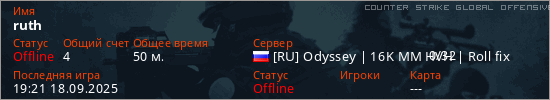 Играет на Counter Strike Global Offensive сервере. Страна: РоссияПервый раз замечен 17:46 06.09.2025