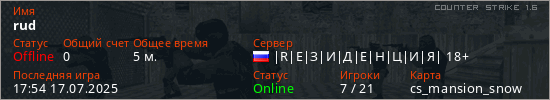 Играет на Counter Strike 1.6 сервере. Страна: РоссияПервый раз замечен 17:46 17.07.2025