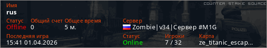 Играет на Counter Strike Source сервере. Страна: РоссияПервый раз замечен 15:39 01.04.2026