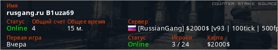 Играет на Counter Strike Source сервере. Страна: РоссияПервый раз замечен 14:34 09.04.2026