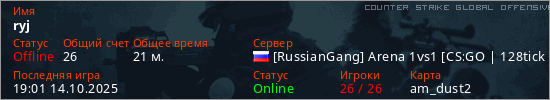 Играет на Counter Strike Global Offensive сервере. Страна: РоссияПервый раз замечен 21:38 13.10.2025