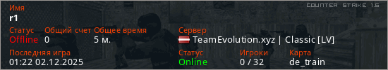 Играет на Counter Strike 1.6 сервере. Страна: ЛатвияПервый раз замечен 01:16 02.12.2025