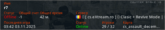 Играет на Counter Strike 1.6 сервере. Страна: РумынияПервый раз замечен 21:49 18.12.2024