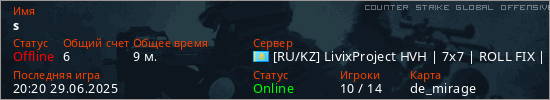 Играет на Counter Strike Global Offensive сервере. Страна: КазахстанПервый раз замечен 18:20 27.06.2025