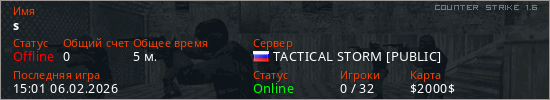 Играет на Counter Strike 1.6 сервере. Страна: РоссияПервый раз замечен 14:59 06.02.2026