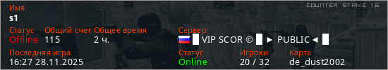 Играет на Counter Strike 1.6 сервере. Страна: РоссияПервый раз замечен 07:32 16.11.2025