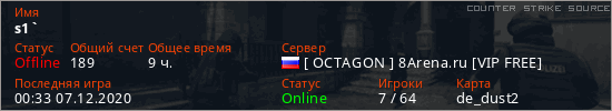 Играет на Counter Strike Source сервере. Страна: РоссияПервый раз замечен 11:20 05.09.2020