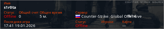 Играет на Counter Strike Source сервере. Страна: РоссияПервый раз замечен 17:39 19.01.2026