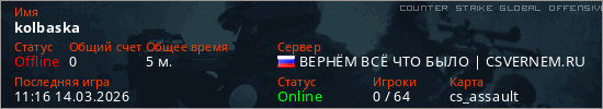 Играет на Counter Strike Global Offensive сервере. Страна: РоссияПервый раз замечен 11:11 14.03.2026