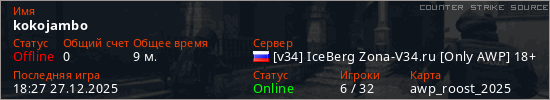 Играет на Counter Strike Source сервере. Страна: РоссияПервый раз замечен 12:34 26.12.2025