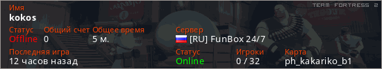 Играет на Team Fortress 2 сервере. Страна: РоссияПервый раз замечен 16:13 08.04.2026