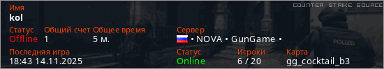 Играет на Counter Strike Source сервере. Страна: РоссияПервый раз замечен 18:41 14.11.2025