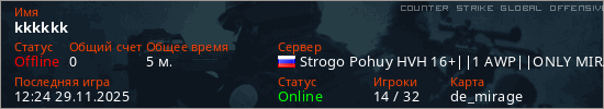 Играет на Counter Strike Global Offensive сервере. Страна: РоссияПервый раз замечен 12:18 29.11.2025