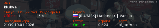 Играет на Team Fortress 2 сервере. Страна: РоссияПервый раз замечен 21:24 19.01.2026