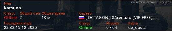 Играет на Counter Strike Source сервере. Страна: РоссияПервый раз замечен 20:02 14.12.2025