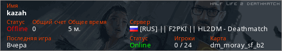 Играет на Half Life 2 DeathMatch сервере. Страна: РоссияПервый раз замечен 13:30 15.02.2026