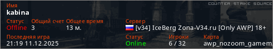 Играет на Counter Strike Source сервере. Страна: РоссияПервый раз замечен 20:13 28.11.2025