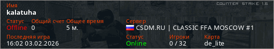Играет на Counter Strike 1.6 сервере. Страна: РоссияПервый раз замечен 15:56 03.02.2026