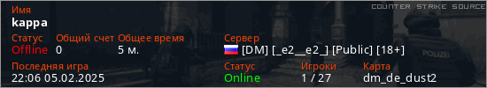 Играет на Counter Strike Source сервере. Страна: РоссияПервый раз замечен 21:50 05.02.2025