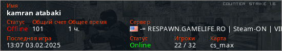 Играет на Counter Strike 1.6 сервере. Страна: СШАПервый раз замечен 18:06 29.01.2025