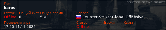Играет на Counter Strike Source сервере. Страна: РоссияПервый раз замечен 17:36 11.11.2025