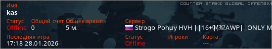 Играет на Counter Strike Global Offensive сервере. Страна: РоссияПервый раз замечен 17:16 28.01.2026