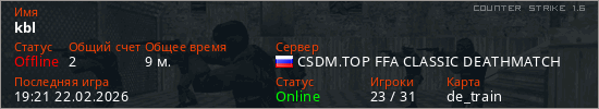 Играет на Counter Strike 1.6 сервере. Страна: РоссияПервый раз замечен 18:34 22.02.2026