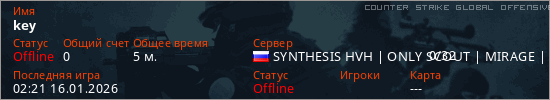 Играет на Counter Strike Global Offensive сервере. Страна: РоссияПервый раз замечен 02:19 16.01.2026