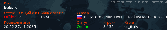 Играет на Counter Strike Global Offensive сервере. Страна: РоссияПервый раз замечен 10:13 26.11.2025