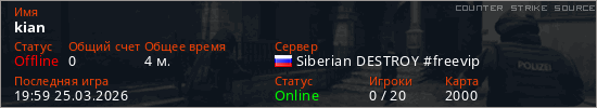 Играет на Counter Strike Source сервере. Страна: РоссияПервый раз замечен 19:47 25.03.2026