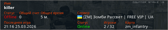 Играет на Counter Strike 1.6 сервере. Страна: УкраинаПервый раз замечен 21:09 25.03.2026