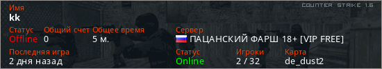 Играет на Counter Strike 1.6 сервере. Страна: РоссияПервый раз замечен 18:53 15.03.2026