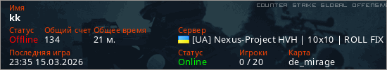 Играет на Counter Strike Global Offensive сервере. Страна: УкраинаПервый раз замечен 20:19 15.03.2026