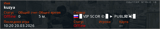 Играет на Counter Strike 1.6 сервере. Страна: РоссияПервый раз замечен 10:18 20.03.2026