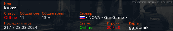 Играет на Counter Strike Source сервере. Страна: РоссияПервый раз замечен 14:31 27.03.2024