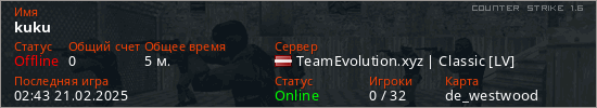 Играет на Counter Strike 1.6 сервере. Страна: ЛатвияПервый раз замечен 01:45 21.02.2025