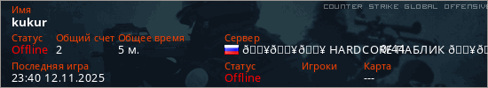 Играет на Counter Strike Global Offensive сервере. Страна: РоссияПервый раз замечен 23:33 12.11.2025