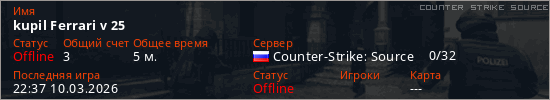 Играет на Counter Strike Source сервере. Страна: РоссияПервый раз замечен 22:18 10.03.2026