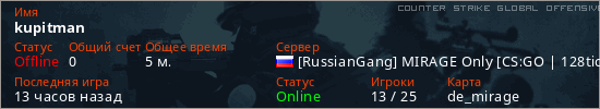 Играет на Counter Strike Global Offensive сервере. Страна: РоссияПервый раз замечен 19:07 14.12.2025