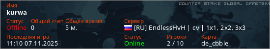 Играет на Counter Strike Global Offensive сервере. Страна: РоссияПервый раз замечен 11:08 07.11.2025