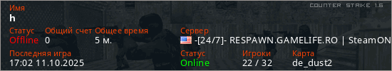 Играет на Counter Strike 1.6 сервере. Страна: СШАПервый раз замечен 16:59 11.10.2025