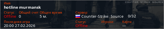 Играет на Counter Strike Source сервере. Страна: РоссияПервый раз замечен 19:51 27.02.2026