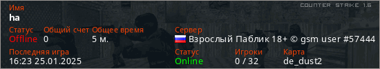 Играет на Counter Strike 1.6 сервере. Страна: РоссияПервый раз замечен 16:17 25.01.2025