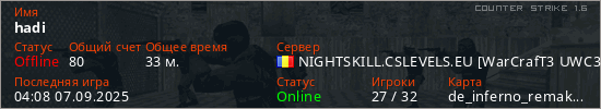 Играет на Counter Strike 1.6 сервере. Страна: РумынияПервый раз замечен 23:37 13.02.2025