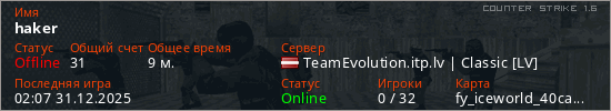 Играет на Counter Strike 1.6 сервере. Страна: ЛатвияПервый раз замечен 01:04 31.12.2025