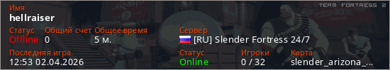 Играет на Team Fortress 2 сервере. Страна: РоссияПервый раз замечен 12:51 02.04.2026