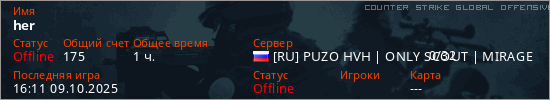 Играет на Counter Strike Global Offensive сервере. Страна: РоссияПервый раз замечен 13:02 23.09.2025