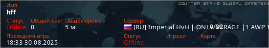 Играет на Counter Strike Global Offensive сервере. Страна: РоссияПервый раз замечен 18:23 30.08.2025